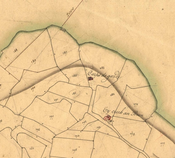 Extrait du cadastre de 1829 : le corps de garde de Saint-Laurent, D 1ère feuille 183 (AD 22)Immatriculation