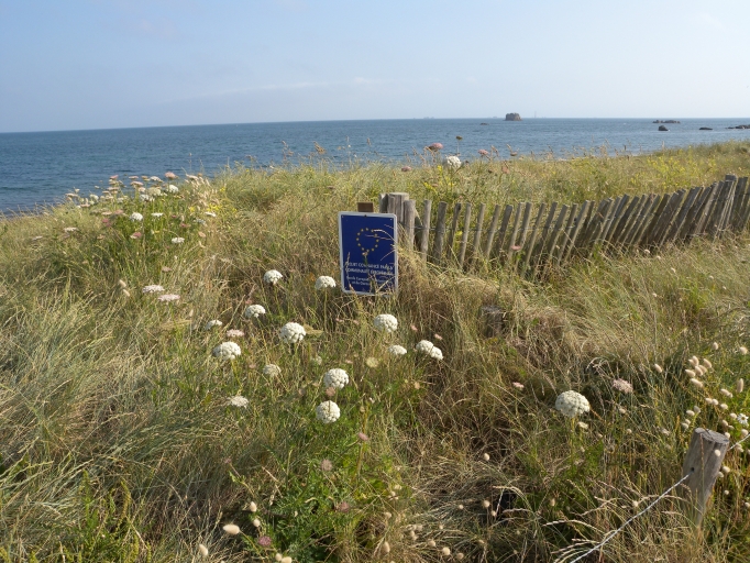 Vue des aménagements réalisés sur le Sillon de Talbert pour reconstituer et protéger la dune : plantations d'oyats et exclos (Conservatoire du Littoral)Immatriculation