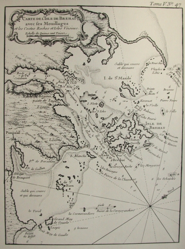Extrait de la carte de Belin, 1764 : carte de Bréhat et des mouillages, dont le Sillon de Talbert, avec sa forme ondulatoire (collection particulière)Immatriculation