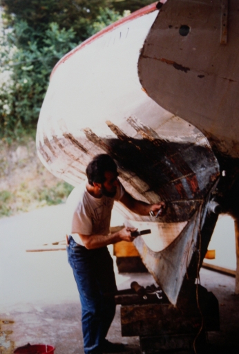 Vue du 'Goéland' en restauration au chantier naval de la Roche Jaune en 1992 : changement du galbord et calfatage du ribord par Yvon ClochetImmatriculation