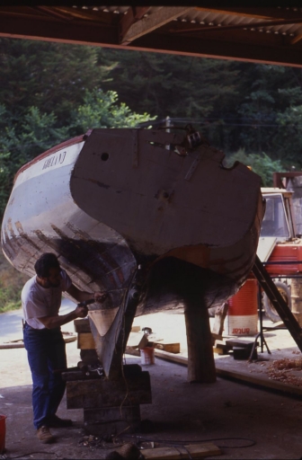 Vue du 'Goéland' en restauration au chantier naval de la Roche Jaune en 1992 : changement du galbord et calfatage du ribord par Yvon ClochetImmatriculation