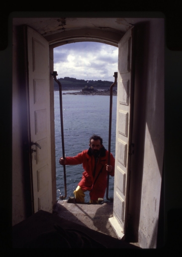 Vue du rez-de-chaussée du phare et de la porte d'entrée, avec le technicien Jean-Yves Le Berre, 2001Immatriculation