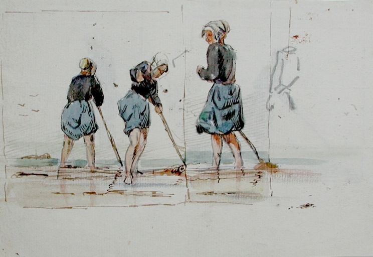 Dessin aquarellé : femmes récoltant le goémon d'épave, avec un croc, 4ème quart 19ème siècle (Faudacq, collection particulière)Immatriculation