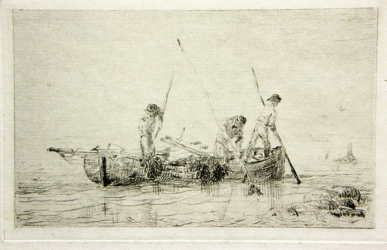 Gravure de Faudacq : pêcheurs goémoniers embarqués utilisant leur guillotine pour couper les algues en eau profonde, 4ème quart 19ème siècle (collection particulière)Immatriculation