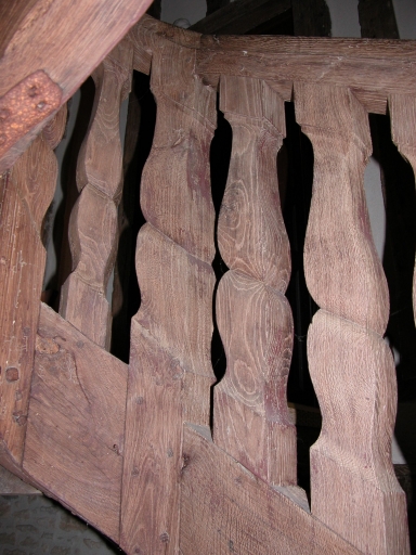 Vue intérieure, escalier central en bois, détail de balustresImmatriculation