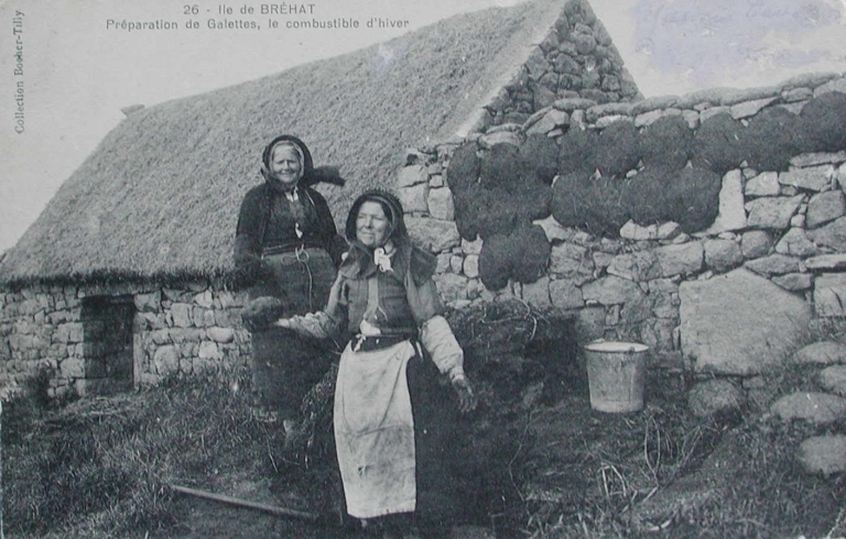 Préparation des combustibles à partir de bouses de vache sèchées sur un muret : Victoire Leroy et sa soeur dite 'Tancette', 1er quart 20ème siècle (carte postale, collection particulière)Immatriculation