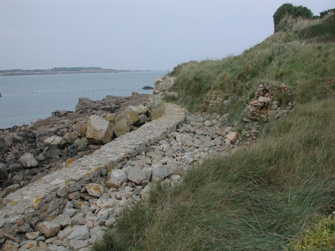 Vue des murs de défense littorale restaurés par le CNG sur la côte Ouest de l'îleImmatriculation