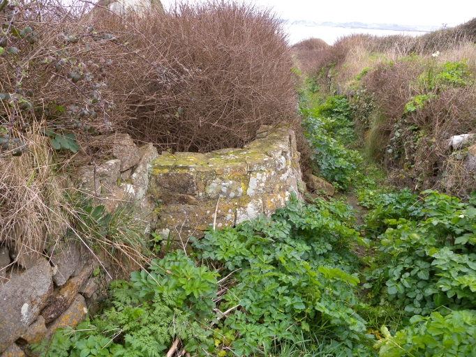 Vue de l'extrémité du mur arrondi d'un jardin religieux, au Sud, bordant un cheminImmatriculation
