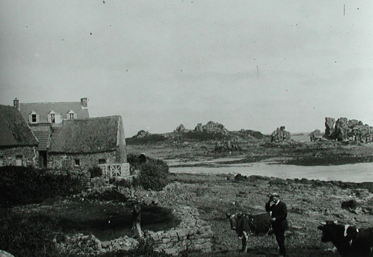 Chaumière traditionnelle bréhatine en bord de mer, à côté de bâtiments couverts en tuile ou en ardoise, 1er quart 20ème siècle (AD 22, Barat)Immatriculation