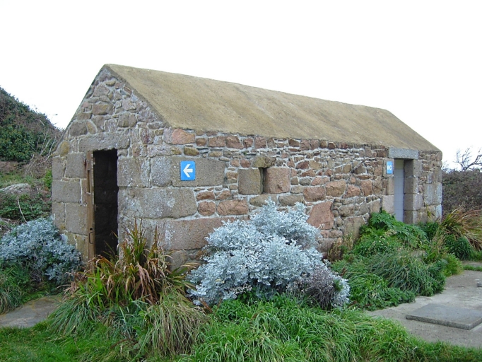 Vue du corps de garde de Feunteun Vin, avec ses nombreuses ouvertures et sa couverture en ciment, île Nord de BréhatImmatriculation