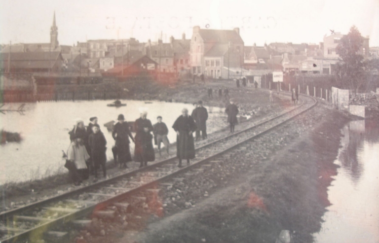 Vue de la voie ferrée un jour d'innondation du Quinic, 1er quart 20ème siècle (carte postale, collection particulière)Immatriculation