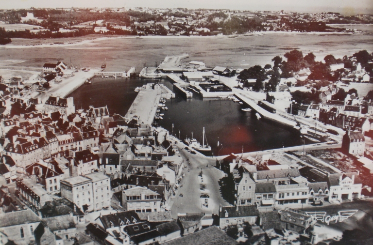 Vue des quais autour des bassins avec les magasins et dépôt des négociants en matériaux, dont Guézennec, la voie ferrée Quai de Kernoa, vers 1950 (carte postale, collection particulière)Immatriculation