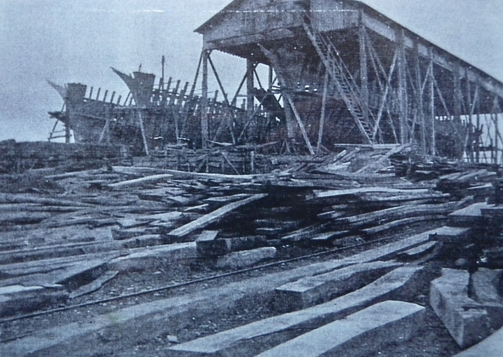Vue du chantier de Poulafret avec 3 navires en construction, 1911 (collection particulière)Immatriculation