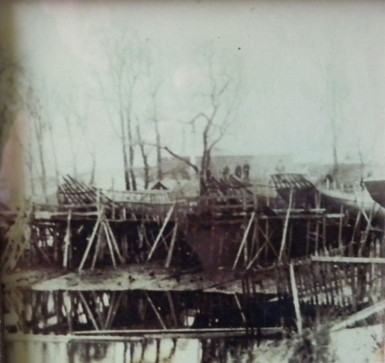 Vue de ' navires en construction devant les hangars à Poulafret, 1er quart 20ème siècle (collection particulière)Immatriculation
