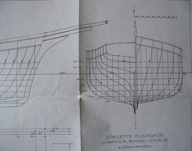 Reproduction d'un plan de forme d'une goélette d'Islande construite par le chantier Bonne-Lesueur, 1er quart 20ème siècle : détail (collection particulière, François Chevalier, 1995)Immatriculation