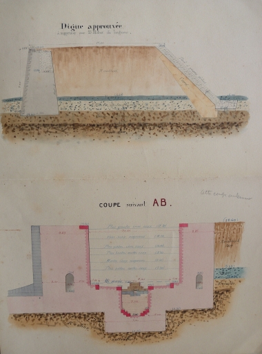 Plan : digue approuvée et coupe en travers de la forme de radoub, 1883 (AD 22)Immatriculation