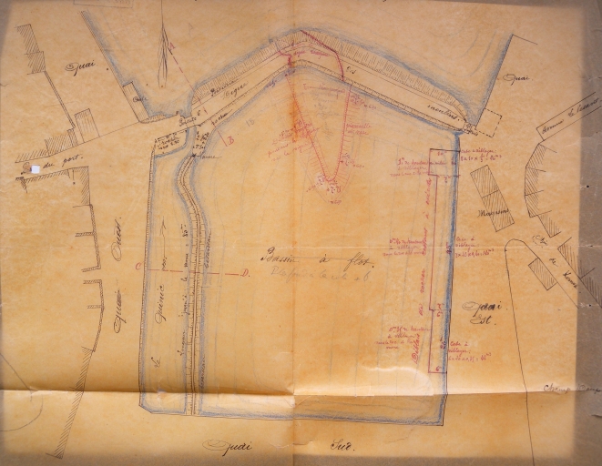 Plan du port et des bassins en 1877 : travaux à effectuer au niveau de la digue des moulins pour aménager le bassin à flot (AD 22)Immatriculation