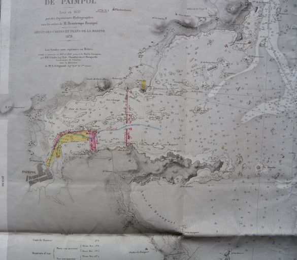 Carte hydrographique, 1893 : projet d'écluse à la pointe de Roc'h ar Fave et de jetée à la pointe de Birvidic, coupant le chenal d'entrée au port (AD 22)Immatriculation