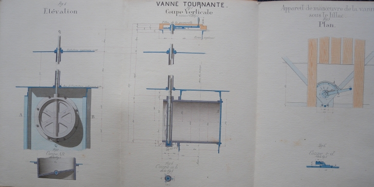 Plan : vue des vannes tournantes du bateau-porte en projet, 1886 (AD 22)Immatriculation