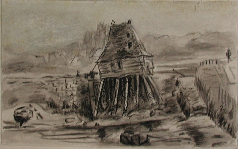 Dessin de Louis-Marie Faudacq : le moulin sur pilotis et la chaussée, non daté, 3ème quart 19ème siècle (collection particulière)Immatriculation