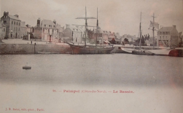 Vue des quais de Kernoa à l'angle du vieux Quai Ouest, où s'amarrent goélettes et sloops, 1er quart 20ème siècle (carte postale, collection particulière)