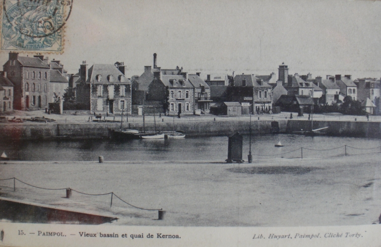 Vue des quais de Kernoa et du Vieux Quai Ouest, devant le bassin, depuis le Quai Neuf, 1er quart 20ème siècle : les guérites des douaniers et le dépôt de ciment Poër à la place de l'armement Garnier aujourd'hui (carte postale, collection particulière)Immatriculation