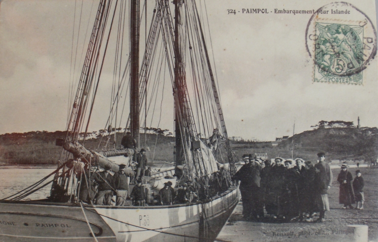 Vue de la goélette 'Anémone' en partance, jetée de Kernoa, 1er quart 20ème siècle (carte postale, collection particulière)Immatriculation