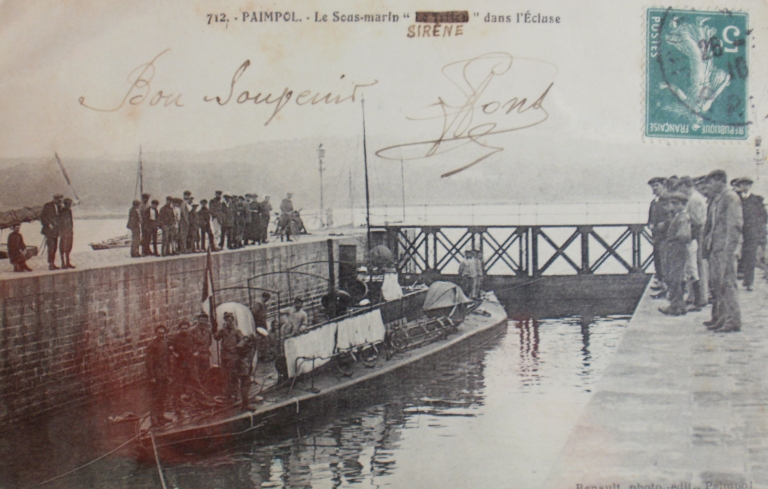 Bateau militaire submersible dans le sas de la nouvelle écluse, 1er quart 20ème siècle (carte postale, collection particulière)Immatriculation