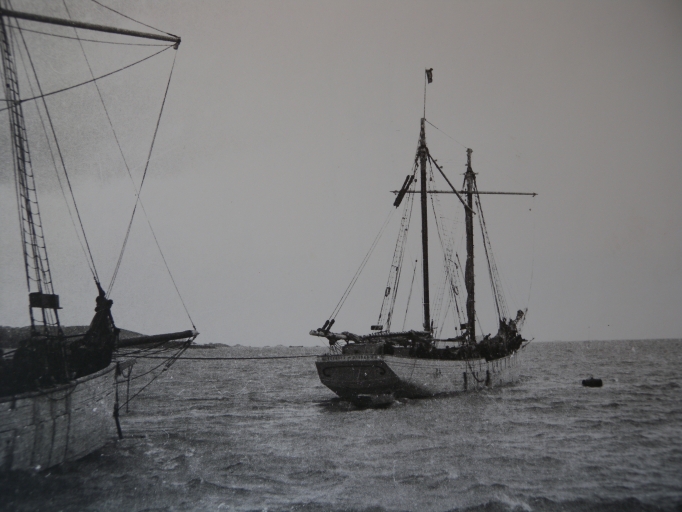 Vue d'une goélette motorisée déhalant un autre bâtiment sous voiles, 1er quart 20ème siècle (collection particulière)Immatriculation