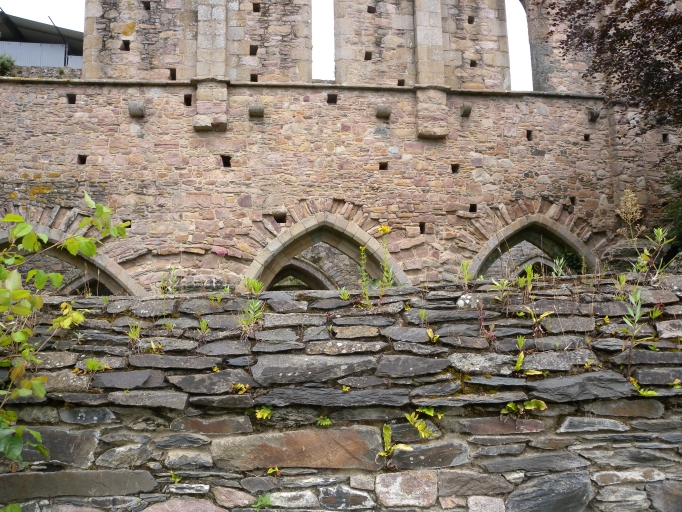 Vue de détail du mur d'enceinte Nord, restauré, construit en moellons de schisteImmatriculation