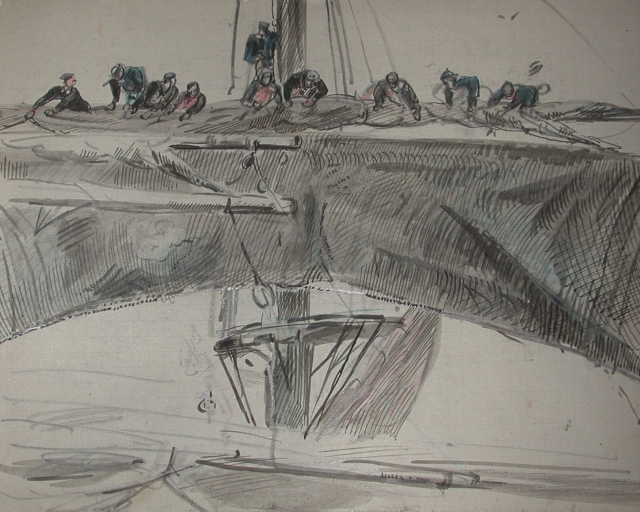Dessin aquarellé de Louis-Marie Faudacq, non daté : manoeuvres de hunier à bord d'une goélette de grande pêche (collection particulière)Immatriculation