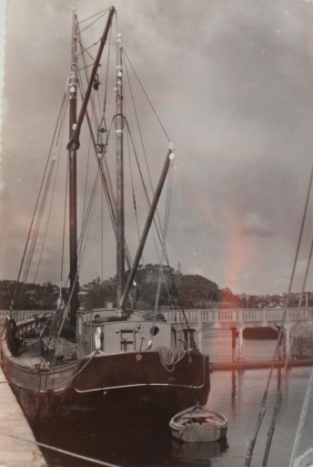 Vue d'une grande gabarre avec son mât de charge dans le bassin de Paimpol, près du déversoir, 2ème quart 20ème siècle (carte postale, collection particulière)Immatriculation