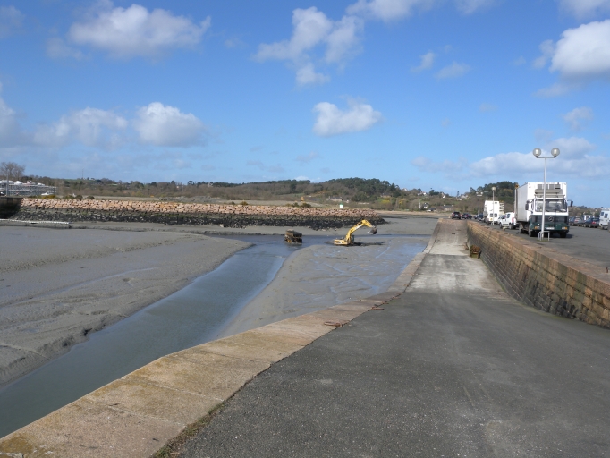 Vue des deux cales de Kernoa, vaigrées en ciment et du mur de quai intérieur en moellons de granite, en face des enrochements de KerpaludImmatriculation