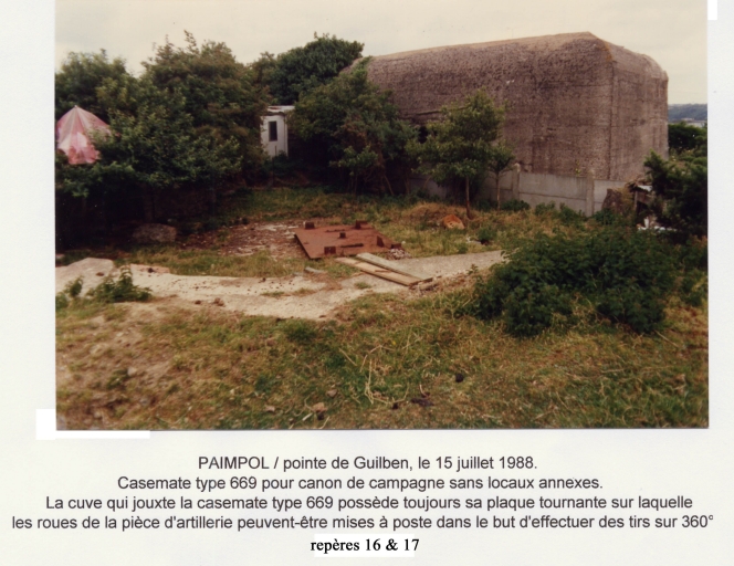 Casemate type 669 pour canon de campagne, repères n° 16 et 17, 15 juillet 1988 (carte, Alain Bohée, collection particulière)Immatriculation