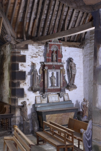 Intérieur : bras sud, retable et mobilier.Immatriculation