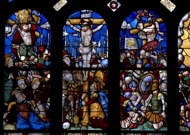 Intérieur, maîtresse-vitre, détail des vitrauxImmatriculation