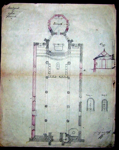 Plan de l'église par Joseph Bigot, 1851, avec projet (non réalisé) d'une sacristie en prolongement du choeur (A. E. Quimper, fonds Bigot, 8 L)Immatriculation