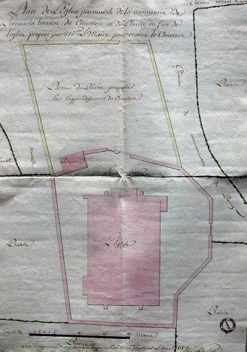 Plan de l'église, du cimetière et du placître pour croître le cimetière, par M. Duchesne, inspecteur de la mine d'huelgoat en 1818 (A. D. Finistère, 2 O 890)Immatriculation