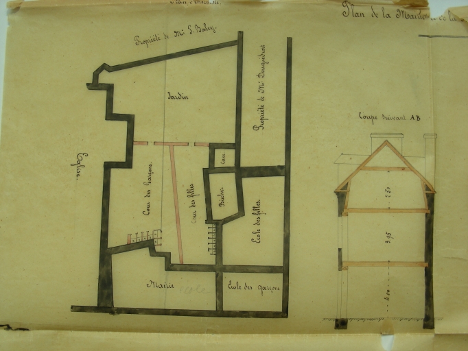 Première mairie-école (projet). Emprise au sol de l'ensemble, 1875 (Archives départementales du Finistère, 2 O 1538)Immatriculation