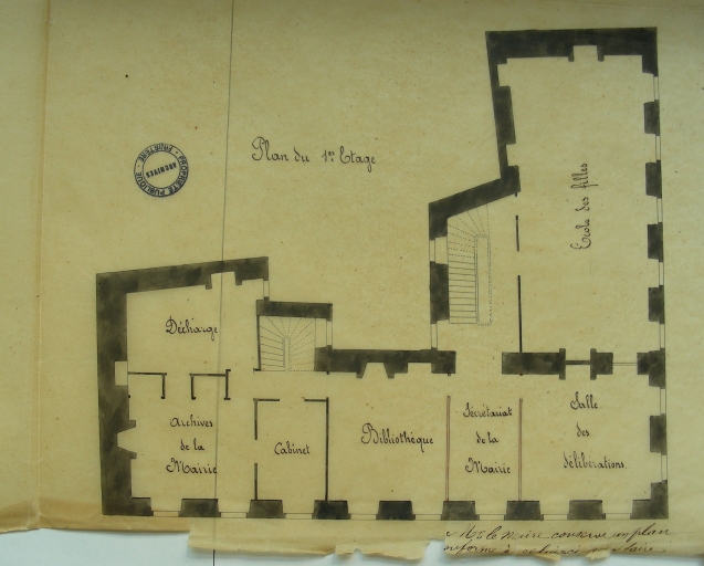 Première mairie-école (projet). Plan du premier étage, 1875 (Archives départementales du Finistère, 2 O 1538)Immatriculation