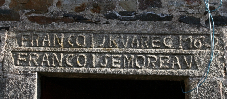 Roscoat. Logis 1, détail du linteau de la porte (1769)Immatriculation