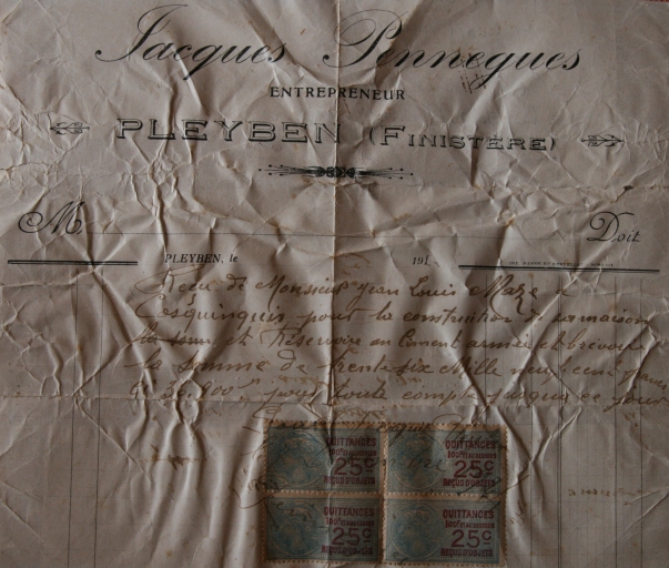 Reçu de l'entrepreneur Jacques Pennegues de Pleyben de la part de Jean-Louis Mazé pour la construction du logis 3, d'une citerne et d'un abreuvoirImmatriculation