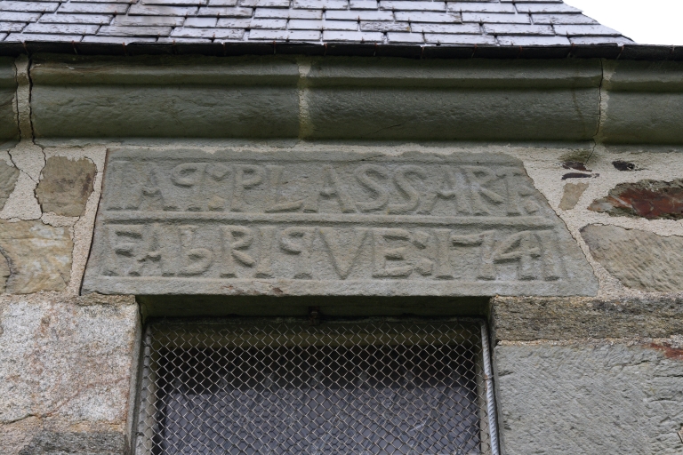 Sacristie, détail de l'inscription du linteau de la fenêtreImmatriculation