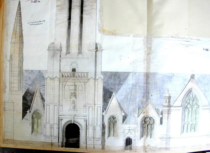 Elévation ouest de l'église, dessin par Joseph Bigot, 1860 (A. E. Quimper, fonds Bigot, 8 L XIII, 74)Immatriculation