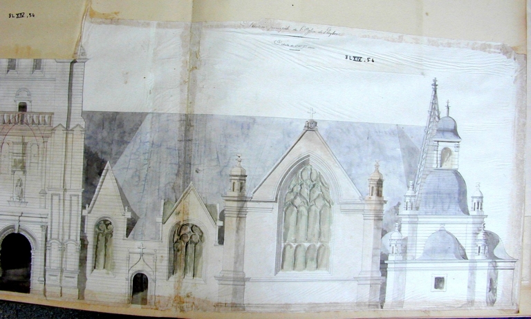 Elévation sud de l'église, dessin par Joseph Bigot, 1860, partie est de l'édifice (A. E. Quimper, fonds Bigot, 8 L XIII, 74)Immatriculation