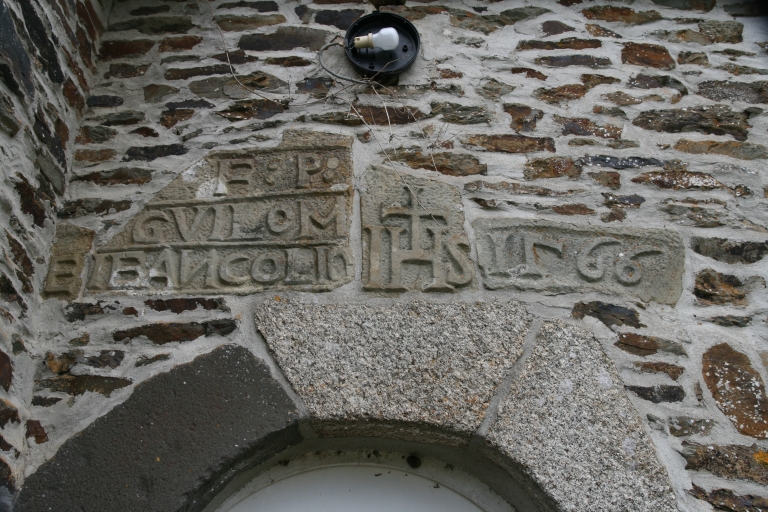 Runandol : logis à avancée (1766) construit pour Guillaume et Jean Colin, détail des inscriptionsImmatriculation