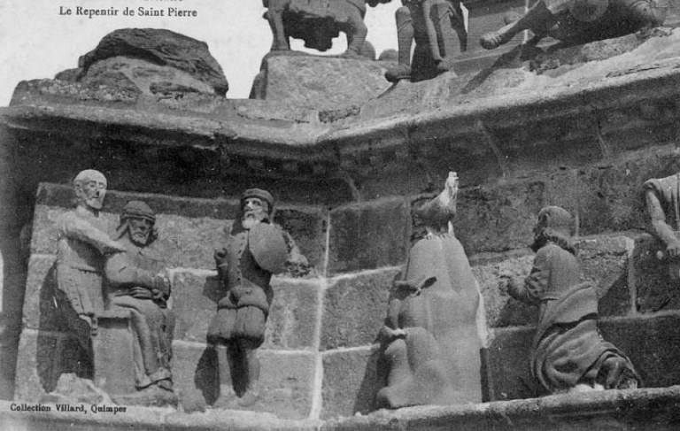 Face ouest, angle nord-ouest : Repentir de Pierre (coq encore en place sur le rocher), carte postale début 20e siècle (collection particulière J.-Y. Kerhoas)Immatriculation