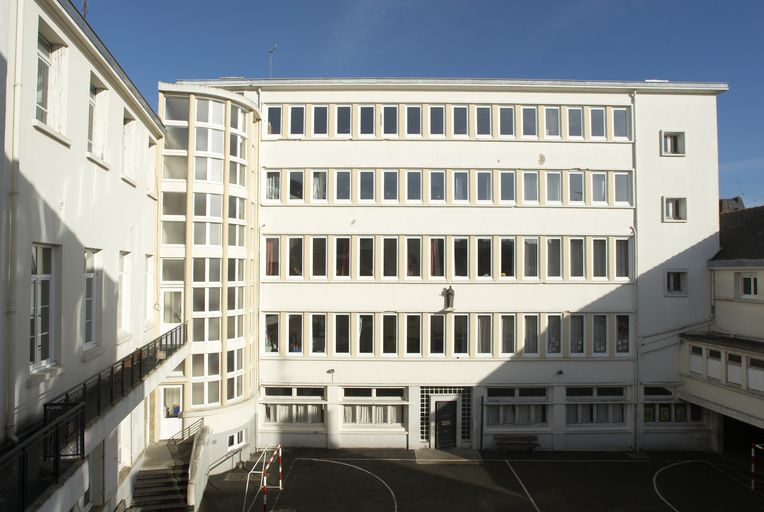 Aile nord reconstruite, élévation sud sur cour (classes).Immatriculation