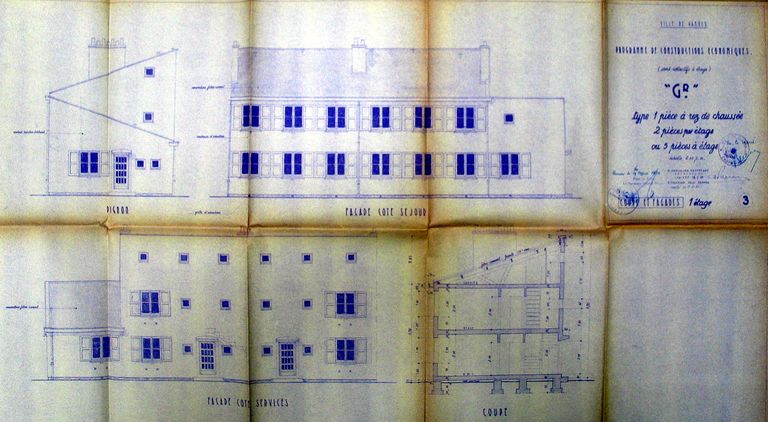 Programmes de constructions économiques, type à 1 étage : coupes et façades par Romualdo-Hautefage, 1951. AM Vannes 5M204.Immatriculation