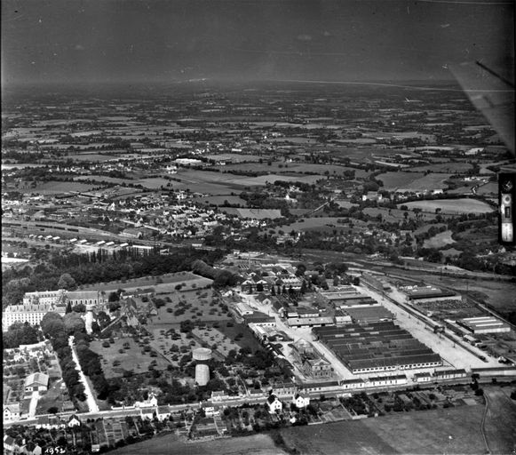 Vue aérienne partie nord ouest et est de la ville à partir de l'arsenal et du Grasdor,1952. AM Vannes photographie Heurtier.Immatriculation